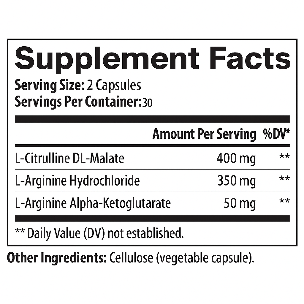 Ingredients: L-Arginine Alpha-Ketoglutarate, L-Arginine Hydrochloride, L-Citrulline DL-Malate, Cellulose (vegetable capsule), Brown Rice Flour.